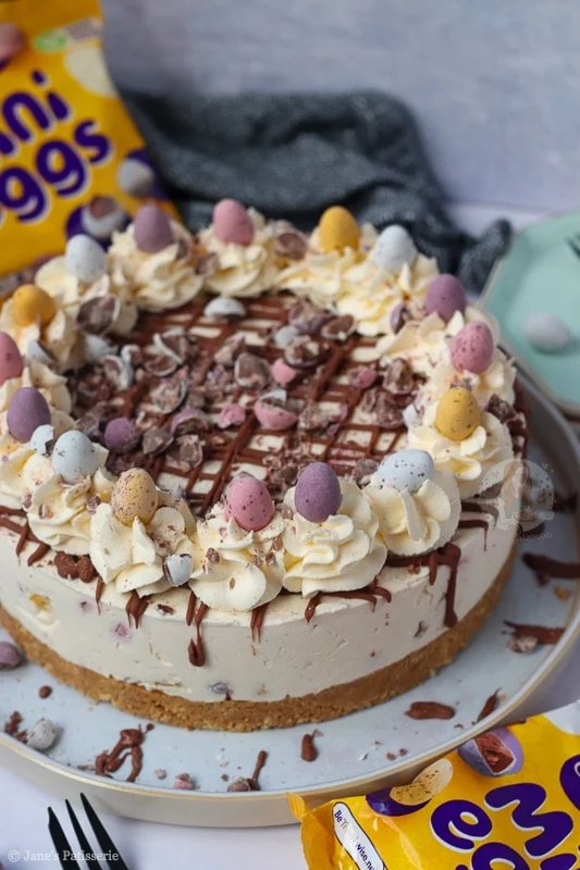 This dessert is my favorite for Easter because it doesn't require any baking. It tastes as good as it looks. The creamy cheesecake filling, studded with crunchy Mini Eggs, creates a textural contrast that's simply irresistible. This cake can be made with simple ingredients like cream cheese, mini eggs, and milk chocolate.