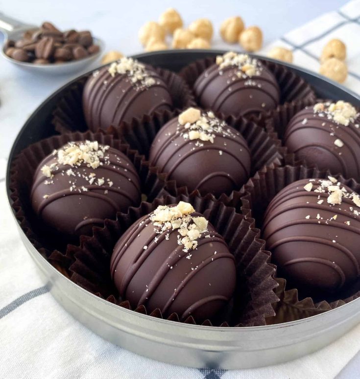 These Hazelnut Espresso Truffles are made for the grown-up holidays. Rich dark chocolate, roasted hazelnuts, and espresso combine to create an awesome, coffeehouse-style dessert that tastes incredibly sophisticated. These truffles are perfect for Christmas dinner parties, holiday brunches, or as a gift for coffee lovers. They pair beautifully with hot chocolate, lattes, or mulled wine.