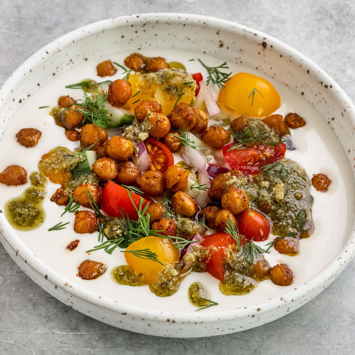 Made with crispy chickpeas, fresh veggies, dill, & pesto, these Savory Yogurt Bowls are just awesome. Also, it's perfect for high protein vegetarian meal prep and healthy snack ideas. You can also serve this as weight loss meal prep. It only needs 40 minutes to prepare, and you can enjoy this.